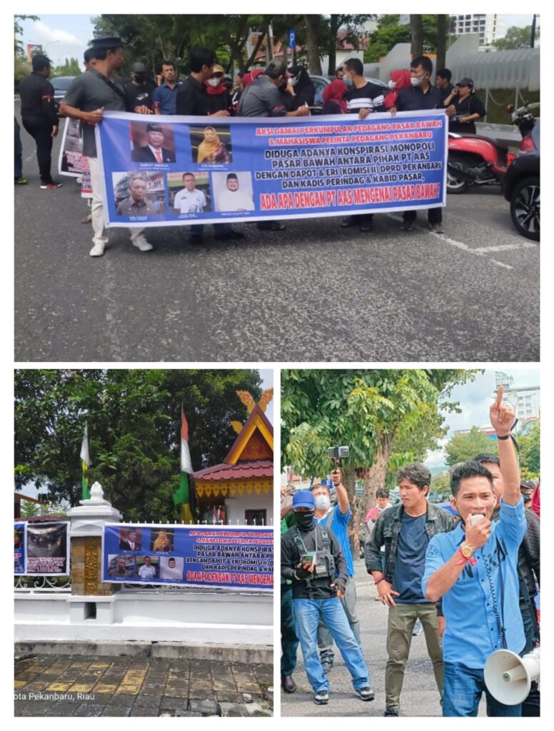 Koordinator Lapangan, Irvan, dalam orasinya menjelaskan bahwa Pemenang tender pengelola aset Daerah Pasar bawah Kota Pekanbaru, yakni PT Ali Akbar Sejahtera (AAS) di duga tidak sah, dan penuh konspirasi untuk kepentingan beberapa kelompok .