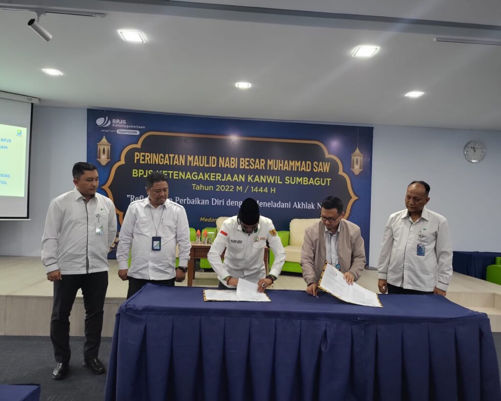BPJS Ketenagakerjaan Kantor Wilayah Sumatera Bagian Utara (Kanwil Sumbagut) lakukan penandatangan kesepakatan (MOU) dengan DPP Santri Tani NU Indonesia bertempat di kantor Kanwil BPJS Ketenagakerjaan Sumbagut, Jalan Pattimura Medan, Jumat (28/10/22)