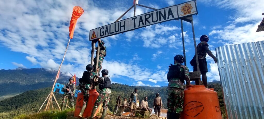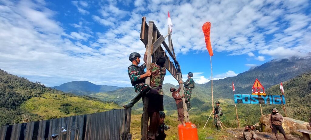 Satgas Yonif Raider 321/GT/13/1 Kostrad bersama masyarakat binaan melaksanakan kegiatan Gotong Royong Memperbaiki Gapura Pos Yigi di Distrik Yigi, Kabupaten Nduga, Papua.