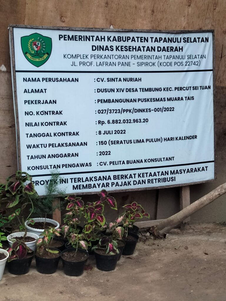 Salah satu proyek Puskesmas yang di bangun di Kecamatan Angkola Muara Tais yang dananya mencapai Rp 6,882.032.963.20 dengan Nomor kontrak 027/3723/PPK/ Dinkes – 001/ 2022 yang dimulai pelaksanaan kerja sesuai kontrak tertanggal 08 Juli 2022 dan selesai selama 150 hari kerja dengan nama pekerjaan Pembangunan Puskesmas Muara Tais yang di kerjakan oleh CV. Sinta Nuriah.