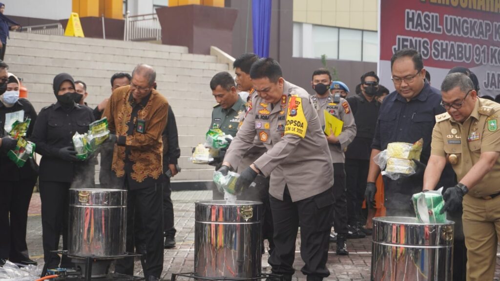 Kepolisian Daerah (Polda) Riau, memusnahkan barang bukti narkoba hasil sitaan saat melakukan pengungkapan kasus.