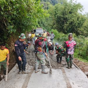 Sejak pagi hari, personel TNI dan warga masyarakat sudah berkumpul di lokasi dengan penuh semangat. Terlihat anggota Satgas membagi tugas secara terstruktur, mulai dari pengukuran dan perataan badan jalan, pemasangan papan begisting di sisi kiri dan kanan, hingga pengadukan material cor.”
