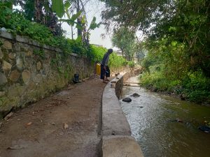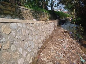 Di lokasi terlihat 5-6 pekerja lengkap sedang aktif memasang batu kali dengan adukan yang cukup. Bekisting kayu terpasang rapi untuk menjaga kelurusan TPT. Material batu belah tertata di sisi jalan, tidak berantakan. Saluran air di samping TPT juga tetap dijaga alirannya.